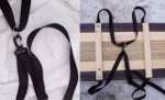 The two V shaped tie-downs are half-inch strapping that, when clipped together, form an X over the top of gear. One side is a fixed length, the other is adjustable with a ladderloc. The two "V"s clip together with a snap and ring.